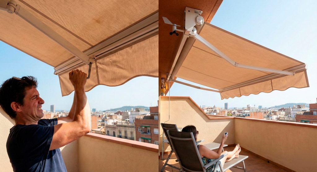 Es la pregunta del millón cuando un cliente entra en nuestro showroom de Barcelona. Ya han decidido el color de la lona, el tipo de estructura (cofre o brazos invisibles), pero llega el momento crucial: ¿Le ponemos motor o lo dejamos con manivela?